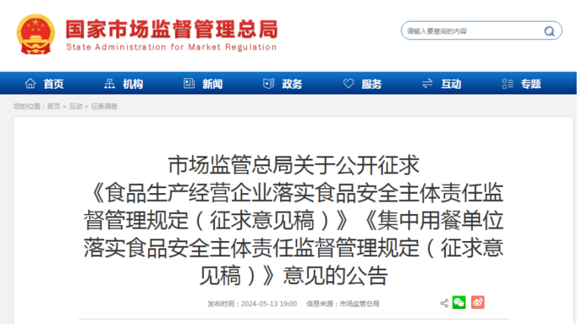 5月14日,為貫徹落實《食品安全法》及(jí)其實施條例有關(guān)規定,進一步督促落實食品生產經營企業主體(tǐ)責任,市場監管總局起草了(le)《食品生產經營企業落實(shí)食品安全主(zhǔ)體責任監督管理規定(征求意見稿)》《集中用餐單位落實食(shí)品安全主體責任監督管理規定(征求意見稿)》,現向(xiàng)社會公開征求意見,意見(jiàn)反饋截止日期(qī)為2024年6月12日。